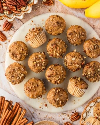 These banana nut bread mini muffins are the easiest, fluffiest pastries swirled with brown sugar and vanilla and studded with toasty pecans (or walnuts)!...