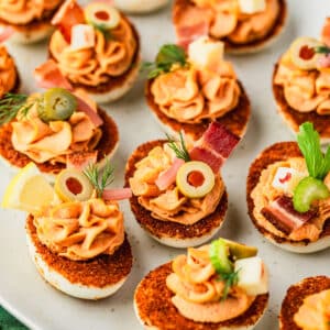 I honestly can’t believe how amazing these Bloody Mary deviled eggs are! They have all the flavor of a classic Bloody Mary in a bite-sized package. Even better, you can customize the toppings with any of your favorites, like bacon, celery, pickles, or even Tajin. This is one of my favorite appetizers for a brunch party or holidays like Easter and Christmas!