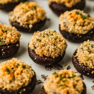My biggest issue with most stuffed mushroom recipes is that the mushrooms come out weird and soggy. To keep this from happening, I like to roast the mushrooms just until they release extra water. It works every time! Of course, this step is optional if you don’t mind classic stuffed mushrooms.