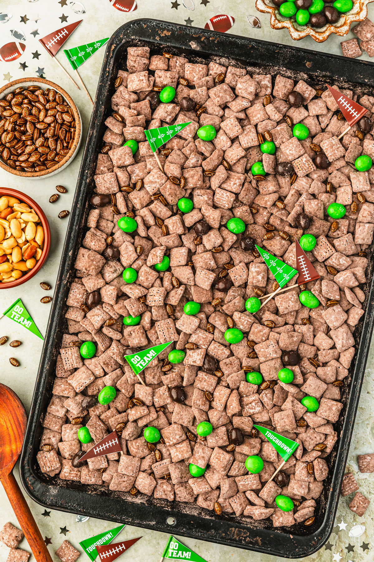 A black pan of football muddy buddies next to star confetti, flag toothpicks, and brown bowls of M&Ms, football sprinkles, and peanuts on a green counter.