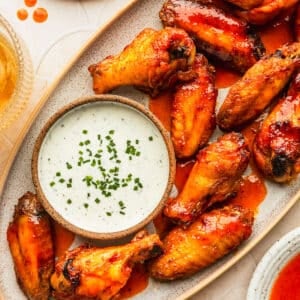 Anyways, per usual, I’m more focused on my Super Bowl menu, and that’s where these wings come in. If you’ve ever made my buffalo chicken pinwheels, slow cooker buffalo chicken dip, or these pull-apart buffalo chicken sliders, you may be aware that I love anything with buffalo sauce. 🤪