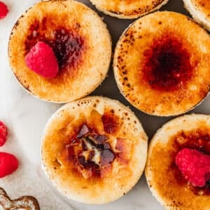 A white platter of mini creme brulee cheesecakes on a white counter next to brown bowls of raspberries and sugar.