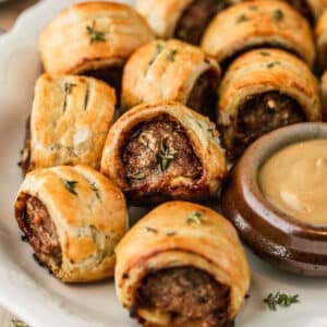 Feel free to use store-bought sausage if you prefer! Just swap the ground pork + spices with 1 pound of sage-flavored sausage (preferably bangers if you can find them!). Then, combine the sausage and breadcrumbs and proceed with the recipe as normal.Look for a thick apple butter. If the apple butter is too thin, it'll make the pastry soggy.Cold puff pastry is key for flaky layers. If the pastry gets too warm, chill the rolls in the fridge or freezer until it firms back up.Keep a close eye to make sure the bottoms aren't burning! If they are cooking too fast, try stacking the sheet pan on another pan to add an extra layer of protection.