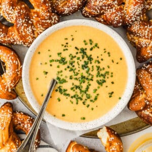 This beer cheese dipping sauce is super easy, flavorful, and amazing with homemade soft pretzels! It's definitely one of my favorite appetizers of all time. It takes just 15 minutes to make, and you can prep it ahead of time for easy serving. You need to give this one a try!