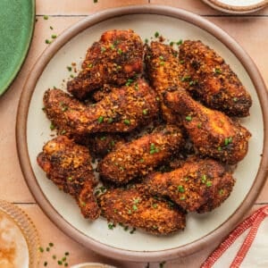 If you can't find party wings, that's totally fine. Just keep in mind that you'll have to break down the whole wings before you make this recipe!Dry all sides of the wings really well. You want them to be as dry as possible so they crisp up instead of steam. If you have time, you can also dry the wings on a wire rack overnight in the fridge. Place the wire rack on a sheet pan to prevent cross contamination and leave the wings uncovered so they dry out.The secret to crispy baked wings is baking powder. Make sure you’re using fresh, aluminum-free baking powder. Not baking soda! Otherwise, the wings will come out with a bitter, metallic aftertaste.If your air fryer is small like mine, you may need to work in batches. Just place the cooked wings on a wire rack and keep them warm at the lowest setting of your oven. Mine is 170°F (77°C).For extra crispy wings, broil them for 1-2 minutes. Just don’t broil them for too long, or the wings will dry out.This recipe will make about 16 wings depending on the size.